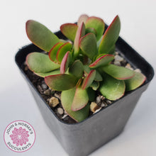 This appears to be a dwarf form of Crassula atropurpurea. Sourced from another grower who couldn't tell us much about them. They were growing in quite shaded filtered light without elongating and also maintaining good colour. They should develop even deeper colour in stronger light and remain compact as evidenced by their visible growth habit.