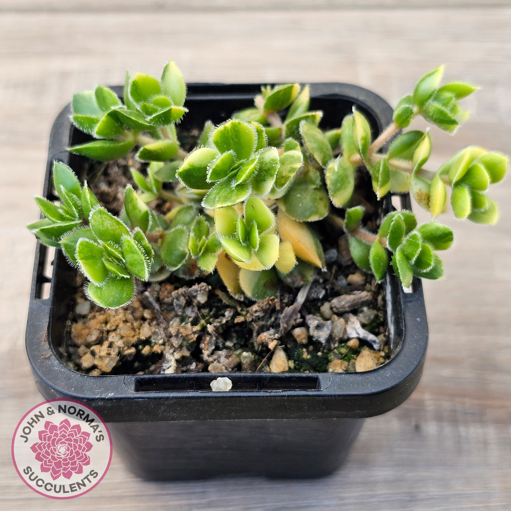 Originating from South Africa, Crassula lanuginosa var. pachystemon 'David' was first collected by David Cumming in the 1980s, and it was later named in his honour by Rudolf Schulz. The variegated form retains the compact, low-growing nature of the original, with fleshy, prostrate branches growing up to 10 cm in length. The plant's disk-shaped leaves, covered in fine white hairs, add a soft, textured appeal, while its white flowers appear in clusters during winter and early summer.