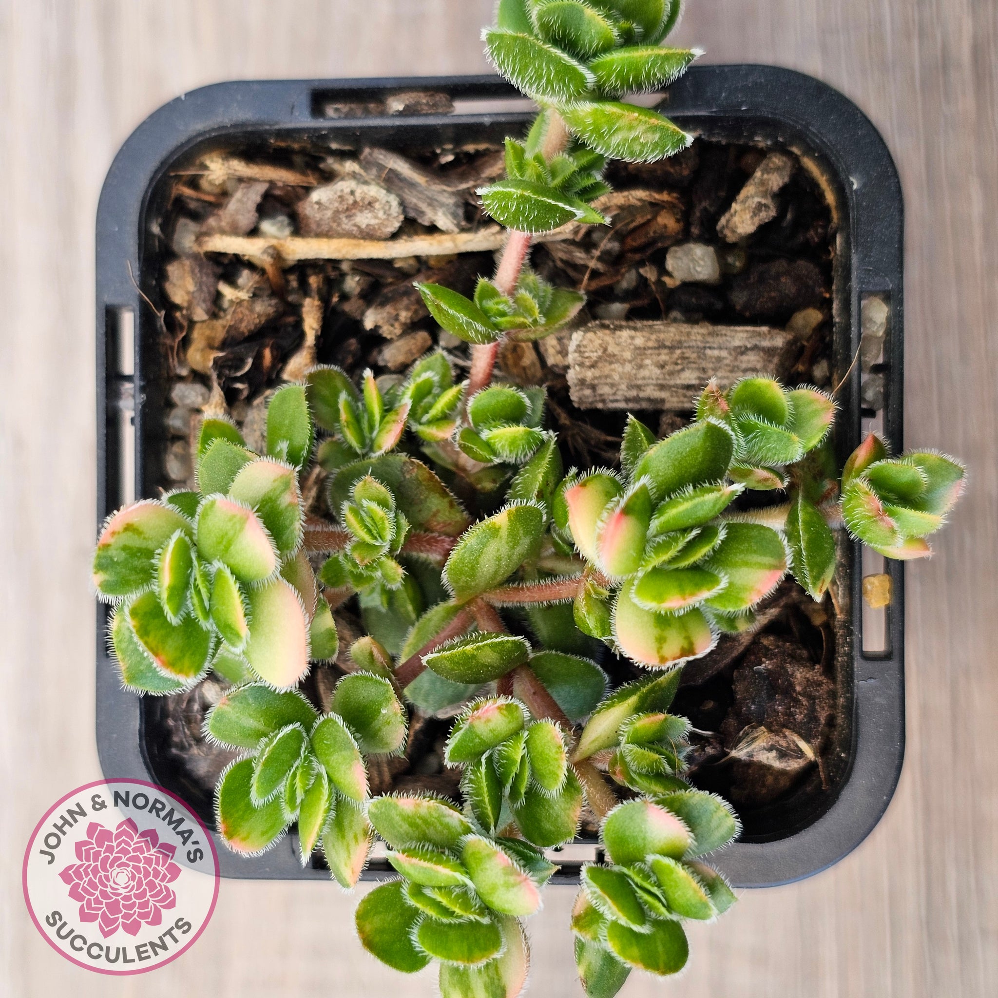 This hardy succulent thrives in full sun to partial shade, though it benefits from morning sun and afternoon shade to prevent leaf burn. It requires well-draining soil and should be watered using the "soak and dry" method. While slightly slower-growing than its non-variegated counterpart, Crassula lanuginosa var. pachystemon 'David' Variegated remains a perfect choice for succulent enthusiasts seeking a rare, eye-catching addition to their collection.